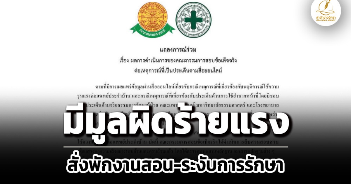 สำนักข่าวอิศรา (www.isranews.org) รายงานว่า เมื่อวันที่ 30 ธันวาคม 2568 เพจเฟซบุ๊ก med.tu ได้เผยแพร่แถลงการณ์ร่วม คณะแพทยศาสตร์ มหาวิทยาลัยธรรมศาสตร์ โรงพยาบาลธรรมศาสตร์เฉลิมพระเกียรติ เรื่อง ผลการดำเนินการของคณะกรรมการสอบข้อเท็จจริง ต่อเหตุการณ์ที่เป็นประเด็นตามสื่อออนไลน์ โดยการแถลงบนหน้าเฟซนั้น เป็นการดำเนินการหลังจากคณะแพทยศาสตร์ มธ. ได้ออกแถลงการณ์ชี้แจง ประเด็นที่โซเชียลเผยเรื่องร้องเรียน อาจารย์หมอ แสดงพฤติกรรมรุนแรงต่อ แพทย์ประจำบ้าน โดยยืนยันว่า ไม่ส่งเสริมการใช้ความรุนแรงทุกรูปแบบ และไม่ได้เพิกเฉย อยู่ในระหว่างสอบข้อเท็จจริง เพื่อความเป็นธรรมกับทุกฝ่าย