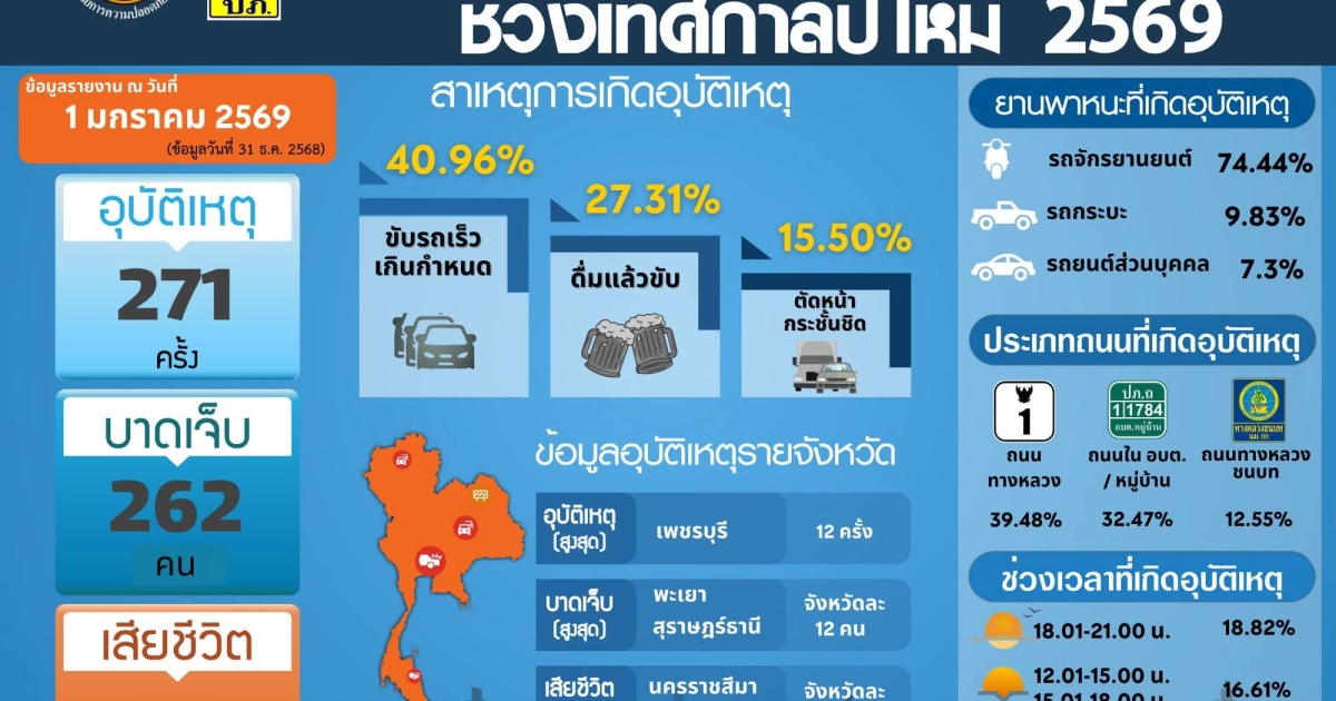 • ปีใหม่ 2 วัน เสียชีวิต 86 ราย นครราชสีมา-สุพรรณบุรี ครองแชมป์ตายสูงสุด
