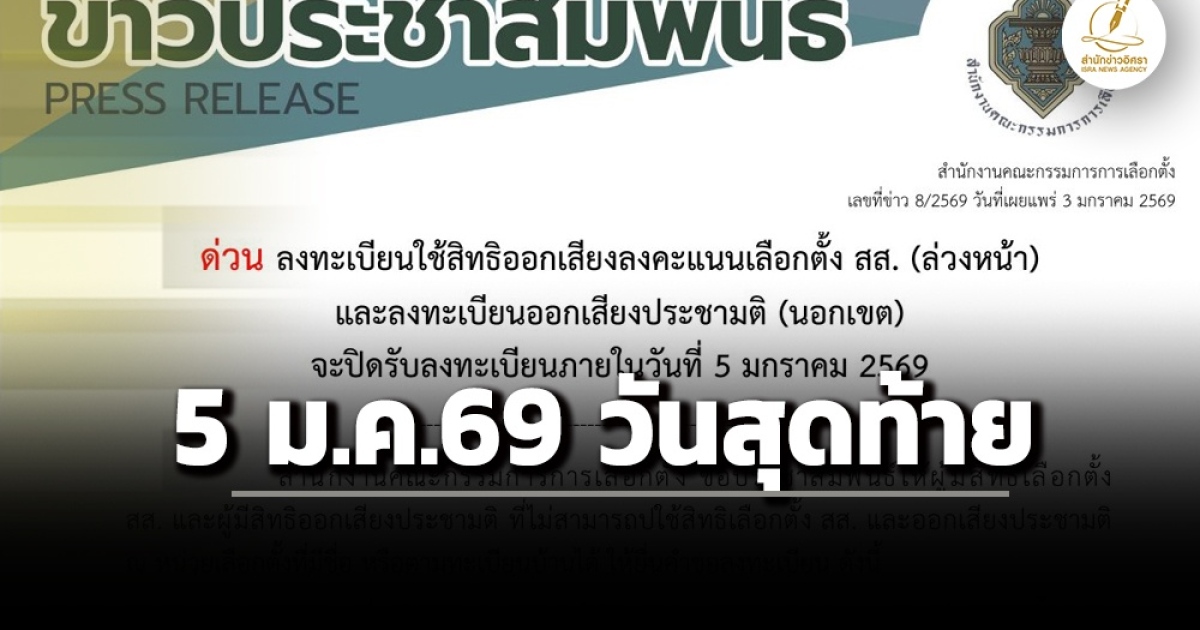 สำนักงาน กกต. สรุปยอดผู้ลงทะเบียนเลือกตั้งล่วงหน้า 1 ก.พ.69 ในเขตเลือกตั้ง-นอกเขตฯ-นอกราชอาณาจักร 14 วัน รวม 1,047,661 คน แจ้งเตือนลงทะเบียนเลือกตั้งล่วงหน้า-ประชามตินอกเขตฯ 5 ม.ค.69 วันสุดท้าย