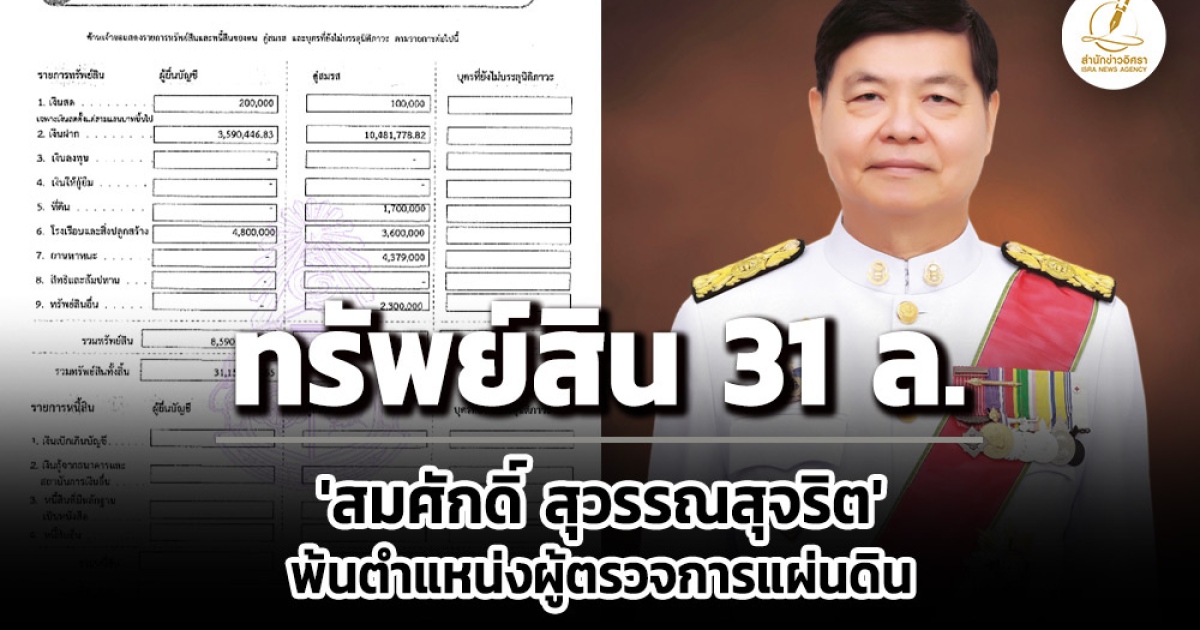 บัญชีทรัพย์สิน 'สมศักดิ์ สุวรรณสุจริต' ผู้ตรวจการแผ่นดิน กรณีพ้นตำแหน่ง ทรัพย์สิน 31.15 ล. รายได้/ปี 3.13 ล. เงินฝาก 6 บัญชี 3.5 ล.