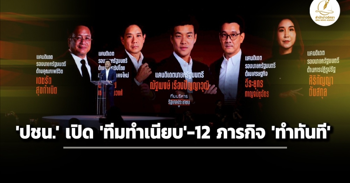 สำนักข่าวอิศรา (www.isranews.org) รายงานว่า วันที่ 11 มกราคม 2569 ที่สามย่านมิตรทาวน์ฮอลล์ พรรคประชาชน (ปชน.) จัดกิจกรรมหาเสียงเลือกตั้งสมาชิกสภาผู้แทนราษฎร (สส.) เป็นการทั่วไปในวันที่ 8 ก.พ.69 โดยนายณัฐพงษ์ เรืองปัญญาวุฒิ หัวหน้นพรรคและแคนดิเดตนายกรัฐมนตรีของพรรคขึ้นกล่าวเปิดงาน ภายใต้ชื่อ เปิดวิสัยทัศน์รัฐบาลประชาชน เปิดตัวทีมบริหาร พร้อม 12 ภารกิจที่รัฐบาลประชาชนจะทำทันทีที่เข้าบริหารประเทศ ว่า วิธีบริหารราชการแผ่นดินของรัฐบาลประชาชน จะเน้นการทำงานแบบ ทีมผู้นำเข้มแข็ง ทำงานเป็นทีม โดยแบ่งภารกิจให้ชัดเจนตามประเด็นปัญหาสำคัญของประเทศ ประกอบไปด้วย ทีมทำเนียบรัฐบาล และ ทีมกระทรวง