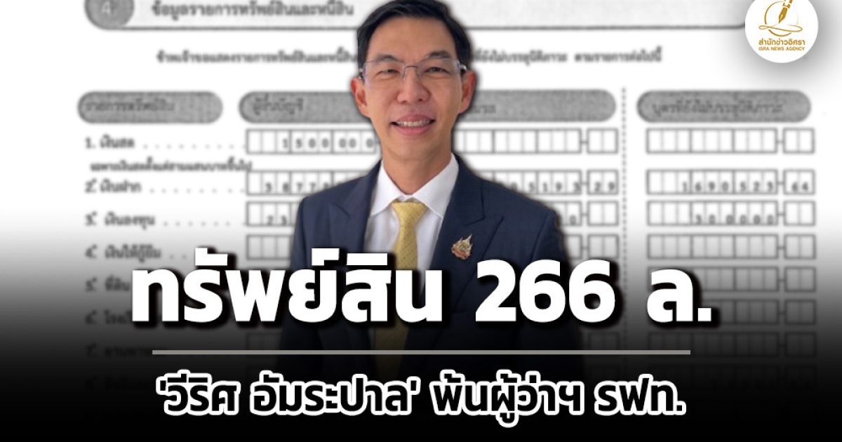 สำนักข่าวอิศรา (www.isranews.org) รายงานว่า เมื่อวันที่ 22 ม.ค. 2569 สำนักงานคณะกรรมการการป้องกันและปราบการทุจริตแห่งชาติ (ป.ป.ช.) เปิดเผยบัญชีแสดงรายการทรัพย์สินและหนี้สิน นายวีริศ อัมระปาล ผู้ว่าการและกรรกาและเลขานุการการรถไฟแห่งประเทศไทย (รฟท.) กรณีพ้นจากการเป็นเจ้าหน้าที่ของรัฐ เมื่อวันที่ 30 ต.ค. 2568