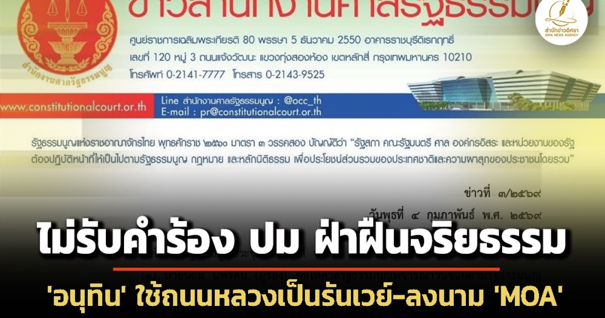 ศาลรัฐธรรมนูญ มีมติเอกฉันท์ ไม่รับคำร้อง ปม ฝ่าฝืนมาตรฐานจริยธรรมอย่างร้ายแรง 2 เรื่อง 'อนุทิน' ใช้ถนนสาธารณะเป็นทางขึ้นลงอากาศยาน เอื้อธุรกิจ ไม่ปรากฎสาระสำคัญเพิ่มเติม - ลงนาม MOA ไม่ปรากฎว่าผู้ร้องถูกละเมิด