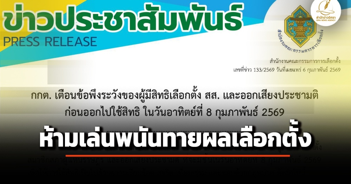 สำนักข่าวอิศรา (www.isranews.org) รายงานว่า วันที่ 6 กุมภาพันธ์ 2569 สำนักงานคณะกรรมการการเลือกตั้ง (กกต.) เผยแพร่ข่าวประชาสัมพันธ์ เตือนข้อพึงระวังของผู้มีสิทธิเลือกตั้ง สส.และการออกเสียงประชามติก่อนออกไปใช้สิทธิ ในวันที่ 8 ก.พ.69 อาทิ ห้ามเล่นพนันทายผลเลือกตั้ง ห้ามแพร่ ผลโพล 7 วันก่อนเลือกตั้งจนถึงปิดหีบ 5 โมงเย็น ห้ามขนคนไป-กลับจากสถานที่เลือกตั้ง โดยไม่เสียค่ารถ ยกเว้นหน่วยงานของรัฐ เพื่ออำนวยความสะดวก ห้ามถ่ายภาพ-โชว์คะแนนให้คนอื่นรู้ว่าเลือกเบอร์อะไร ผู้บังคับบัญชา-นายจ้างไม่ให้ไปเลือกตั้งจำคุกไม่เกิน 2 ปี ปรับไม่เกิน 40,000 บาท โดยมีรายละเอียดทั้งหมดดังต่อไปนี้