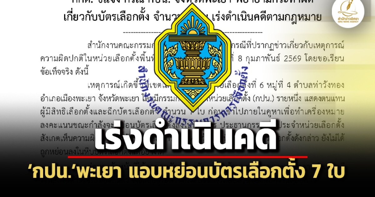 สำนักข่าวอิศรา (www.isranews.org) รายงานว่า เมื่อวันที่ 8 ก.พ. สำนักงานคณะกรรมการการเลือกตั้ง (สำนักงาน กกต.) ได้เผยแพร่เอกสารข่าว ชี้แจงกรณีที่ปรากฏข่าวเกี่ยวกับเหตุการณ์ความผิดปกติในหน่วยเลือกตั้งพื้นที่จังหวัดพะเยา เมื่อวันที่ 8 ก.พ.2569 โดยมีข้อเท็จจริง ดังนี้