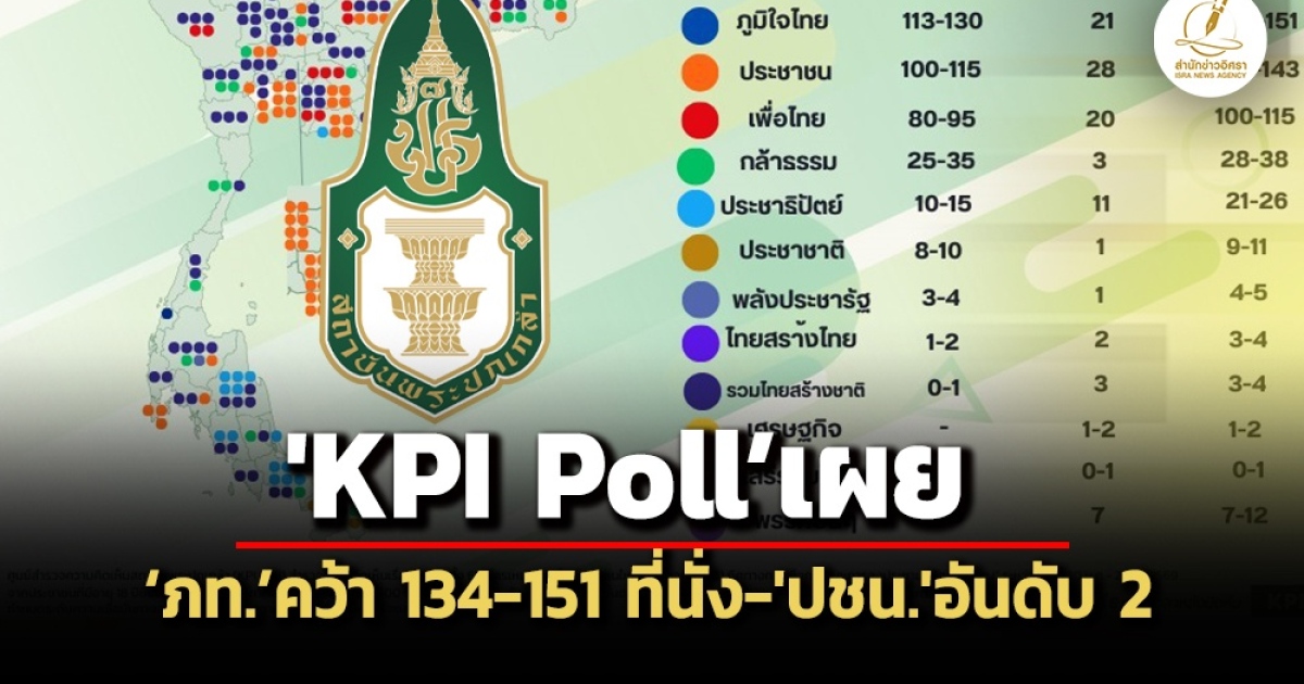 ‘สถาบันพระปกเกล้า’ เผยผลสำรวจ ‘KPI Poll’ เผย ‘ภท.’ คว้า 134-151 ที่นั่ง ส่วน ‘ปชน.’ ได้ 128-143 ที่นั่ง ขณะที่ ‘พท.’ มาอันดับ 3 ด้าน ‘อนุทิน ชาญวีรกูล’ อันดับ 1 นั่งเก้าอี้ ‘นายกฯ’ ด้าน 'สวนดุสิตโพล'คาด 'ประชาชน' ได้สส.อันดับ 1 ได้ 165 ที่นั่ง