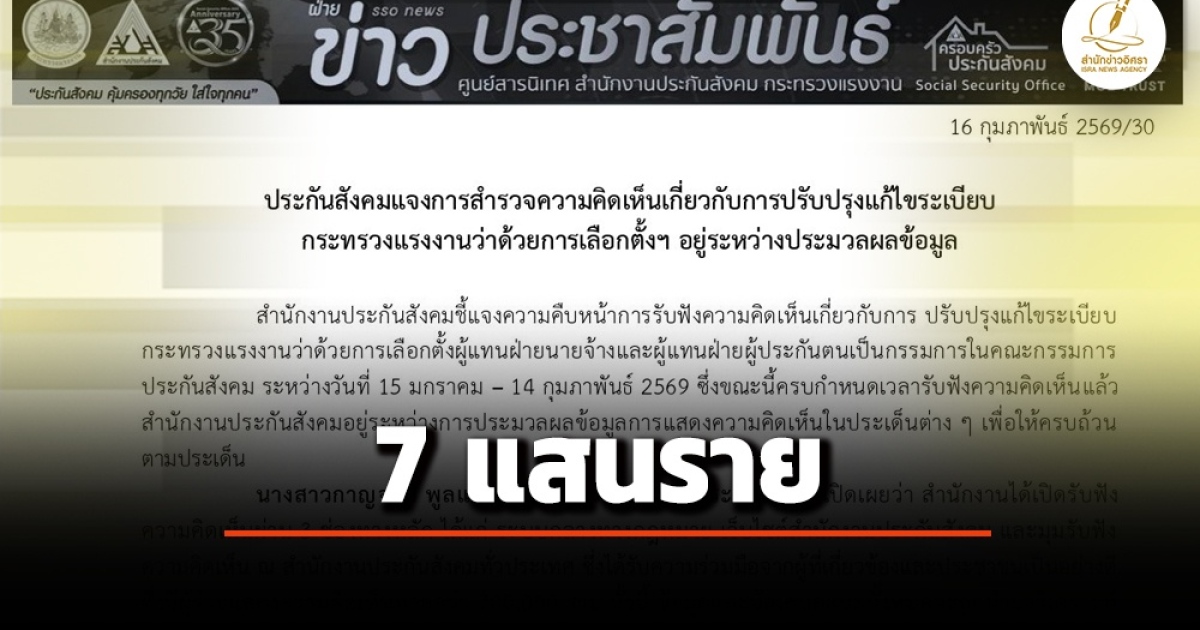 สำนักข่าวอิศรา (www.isranews.org) รายงานว่า วันที่ 16 กุมภาพันธ์ 2569 ศูนย์สารนิเทศ สำนักงานประกันสังคม กระทรวงแรงงาน เผยแพร่ข่าวประชาสัมพันธ์ เรื่อง ประกันสังคมแจงการสำรวจความคิดเห็นเกี่ยวกับการปรับปรุงแก้ไขระเบียบกระทรวงแรงงานว่าด้วยการเลือกตั้งฯ อยู่ระหว่างประมวลผลข้อมูล