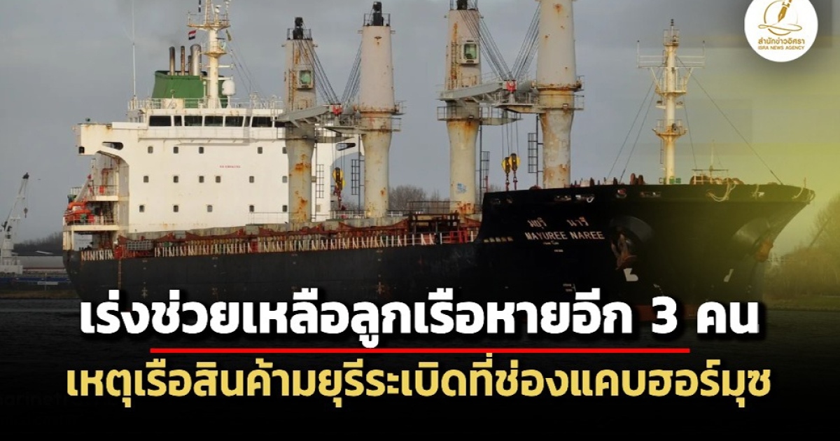 ‘กรมเจ้าท่า’ ตั้งศูนย์ติดตามสถานการณ์หลังเรือสินค้า ‘มยุรีนารี’ ถูกระเบิดโจมตีที่ช่องแคบฮอร์มุซ พบปลอดภัยแล้ว 20 ราย เหลืออีก 3 รายยังสูญหาย เร่งประสานหน่วยงานที่เกี่ยวข้อง ทำการช่วยเหลือ