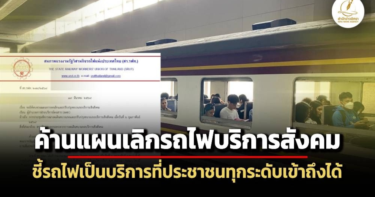 สำนักข่าวอิศรา (www.isranews.org) รายงานว่า วันที่ 21 มีนาคม 2569 นายสราวุธ สราญวงศ์ ประธานสหภาพแรงงานรัฐวิสาหกิจรถไฟแห่งประเทศไทย (สร.รฟท.) ยื่นหนังสือถึงผู้อำนวยการฝ่ายบริการโดยสาร (อดส.) เรื่อง ขอให้ทบทวนแผนการยกเลิกและปรับปรุงขบวนรถบริการเชิงสังคม