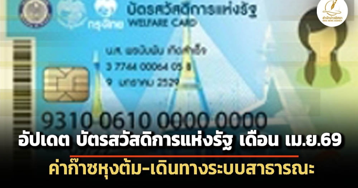 กรมบัญชีกลาง อัปเดต บัตรสวัสดิการแห่งรัฐ เดือนเมษายน 2569 วงเงินส่วนลดค่าซื้อก๊าซหุงต้ม 80 บาทต่อคนต่อ 3 เดือน ค่าเดินทางผ่านระบบขนส่งสาธารณะ 750 บาทต่อคนต่อเดือน