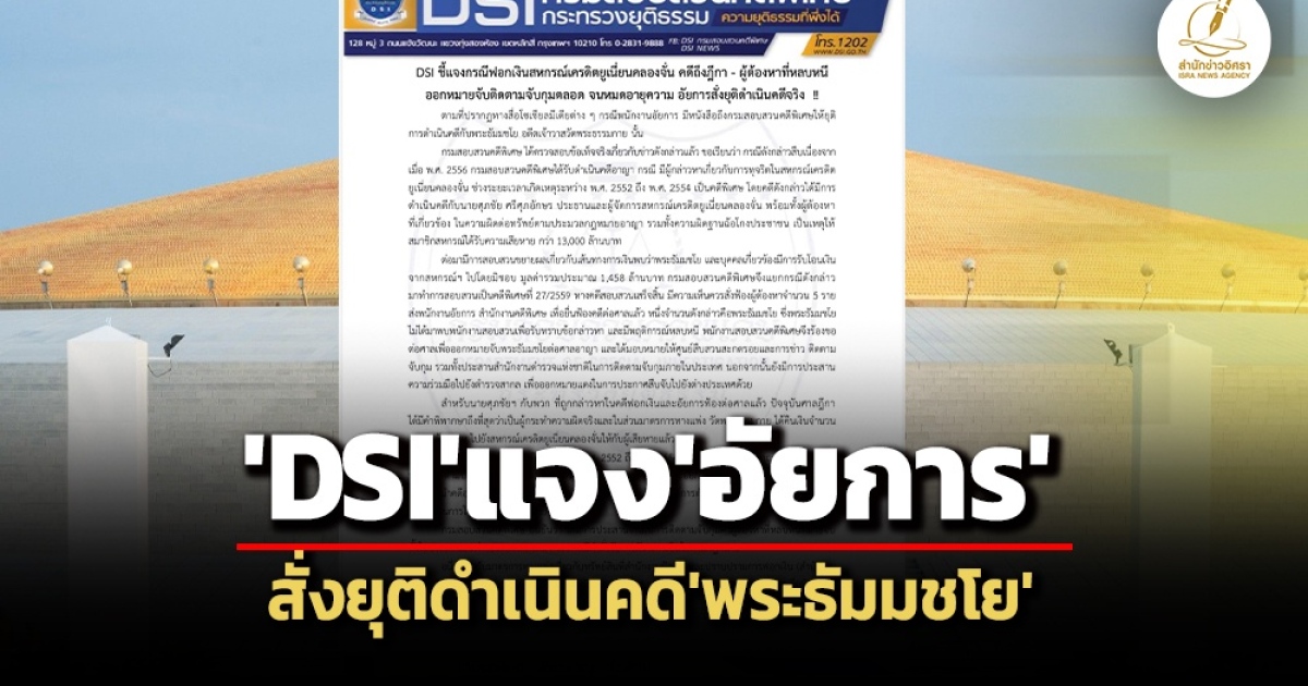 ‘ดีเอสไอ’ แจงคดีฟอกเงิน ‘สหกรณ์เครดิตยูเนี่ยนคลองจั่นฯ’ อยู่ในชั้น ‘ศาลฎีกา’ รับ ‘อัยการ’ สั่งยุติดำเนินคดี ‘อดีตเจ้าวาสวัดพระธรรมกาย’ จริง หลังคดีขาดอายุความ