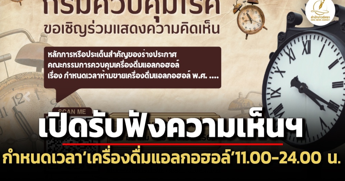 สำนักข่าวอิศรา (www.isranews.org) รายงานว่า เมื่อวันที่ 25 มี.ค.ที่ผ่านมา กรมควบคุมโรค กระทรวงสาธารณสุข (สธ.) เปิดรับฟังความคิดเห็นร่างประกาศคณะกรรมการควบคุมเครื่องดื่มแอลกอฮอล์ เรื่อง กำหนดเวลาห้ามขายเครื่องดื่มแอลกอฮอล์ พ.ศ... เพื่อประกอบการพิจารณามาตรการกำหนดเวลาห้ามขายเครื่องดื่มแอลกอฮอล์ ของคณะกรรมการควบคุมเครื่องดื่มแอลกอฮอล์ โดยกรมควบคุมโรค จะเปิดรับฟังความคิดเห็นฯไปจนถึงวันที่ 23 เม.ย.2569