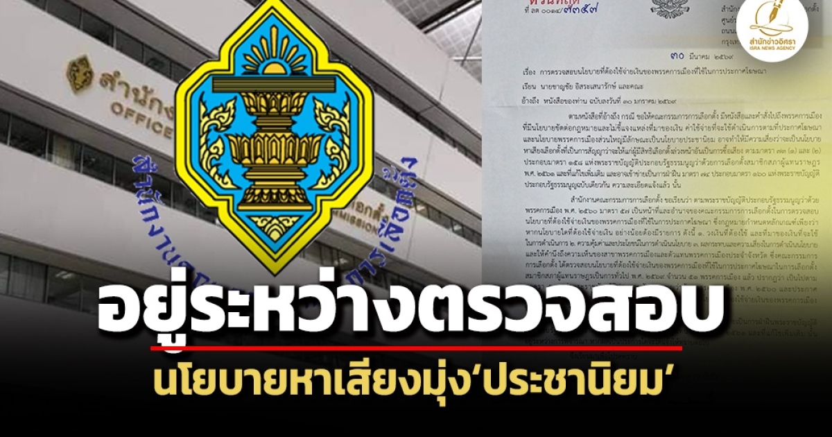 อนึ่ง กรณี ที่กล่าวหาว่านโยบายของพรรคการเมืองอาจเข้าข่ายเป็นการฝ่าฝืน พ.ร.บ.ประกอบรัฐธรรมนูญว่าด้วยการเลือกตั้งสมาชิกสภาผู้แทนราษฎร พ.ศ.2561 และที่แก้ไขเพิ่มเติม นั้น อยู่ระหว่างการพิจารณา หากผลเป็นประการใดจะได้แจ้งให้ทราบต่อไป” หนังสือสำนักงานคณะกรรมการการเลือกตั้ง ด่วนที่สุดที่ ลต 0014/7357 เรื่อง การตรวจสอบนโยบายที่ต้องใช้จ่ายเงินของพรรคการเมืองที่ใช้ในการประกาศโฆษณา ลงวันที่ 30 มี.ค.2569 ระบุ