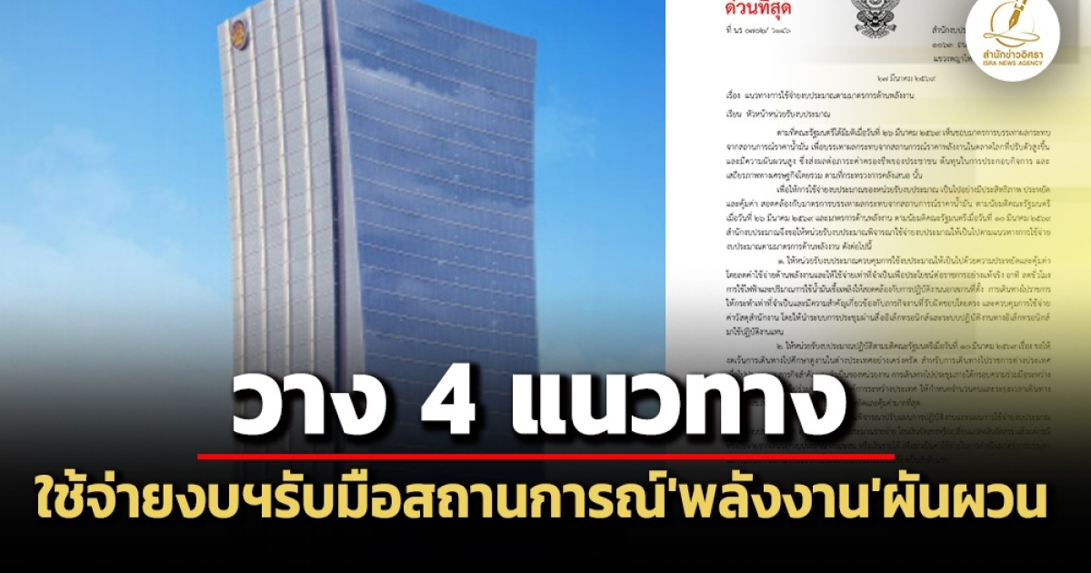 สำนักข่าวอิศรา (www.isranews.org) รายงานว่า เมื่อเร็วๆนี้ สำนักงบประมาณ ได้ทำหนังสือด่วนที่สุด ที่ นร 0702/146 เรื่อง แนวทางการใช้จ่ายงบประมาณตามมาตรการด้านพลังงาน ลงวันที่ 27 มี.ค.2569 แจ้งไปยังหัวหน้าหน่วยรับงบประมาณ โดยสำนักงบประมาณขอให้หน่วยรับงบประมาณทุกแห่งพิจารณาใช้จ่ายงบประมาณให้เป็นไปตามแนวทางการใช้จ่ายงบประมาณตามมาตรการด้านพลังงานตามนัยมติคณะรัฐมนตรี เมื่อวันที่ 10 และ 26 มี.ค.2569