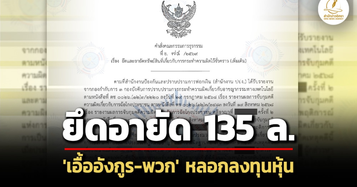 สำนักข่าวอิศรา (www.isranews.org) รายงานว่า เมื่อวันที่ 8 เมษายน 2569 สำนักงานป้องกันและปราบปรามการฟอกเงิน (ปปง.) มีคำสั่งคณะกรรมการธุรกรรม ที่ ย. 74 /2569 เรื่อง ยึดและอายัดทรัพย์สินที่เกี่ยวกับการกระทำความผิดไว้ชั่วคราว (เพิ่มเติม) รายนายเอื้ออังกูร กับพวก ซึ่งเป็นกรณีมีพฤติการณ์แห่งการกระทำความผิดเกี่ยวกับการฉ้อโกงประชาชนตามประมวลกฎหมายอาญา ความผิดเกี่ยวกับการเป็นสมาชิกอั้งยี่ และความผิดฐานฟอกเงิน โดยเป็นการยึดและอายัดทรัพย์สินเพิ่มเติมจำนวน 211 รายการ พร้อมดอกผล มูลค่ารวมประมาณ 135,318,035.88 บาท (ดูเอกสารท้ายข่าว)