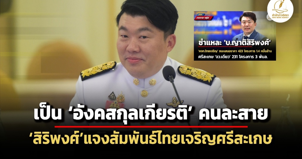‘สิริพงศ์’รมช.คมนาคมแจง ‘อิศรา’ สัมพันธ์หจก.ไทยเจริญศรีสะเกษรับงานก่อสร้างหลักหมื่นล้าน ยืนยันเป็นเพียงลูกพี่ลูกน้อง ไม่ได้สนิทกัน เป็น ‘อังคสกุลเกียรติ’ คนละสาย