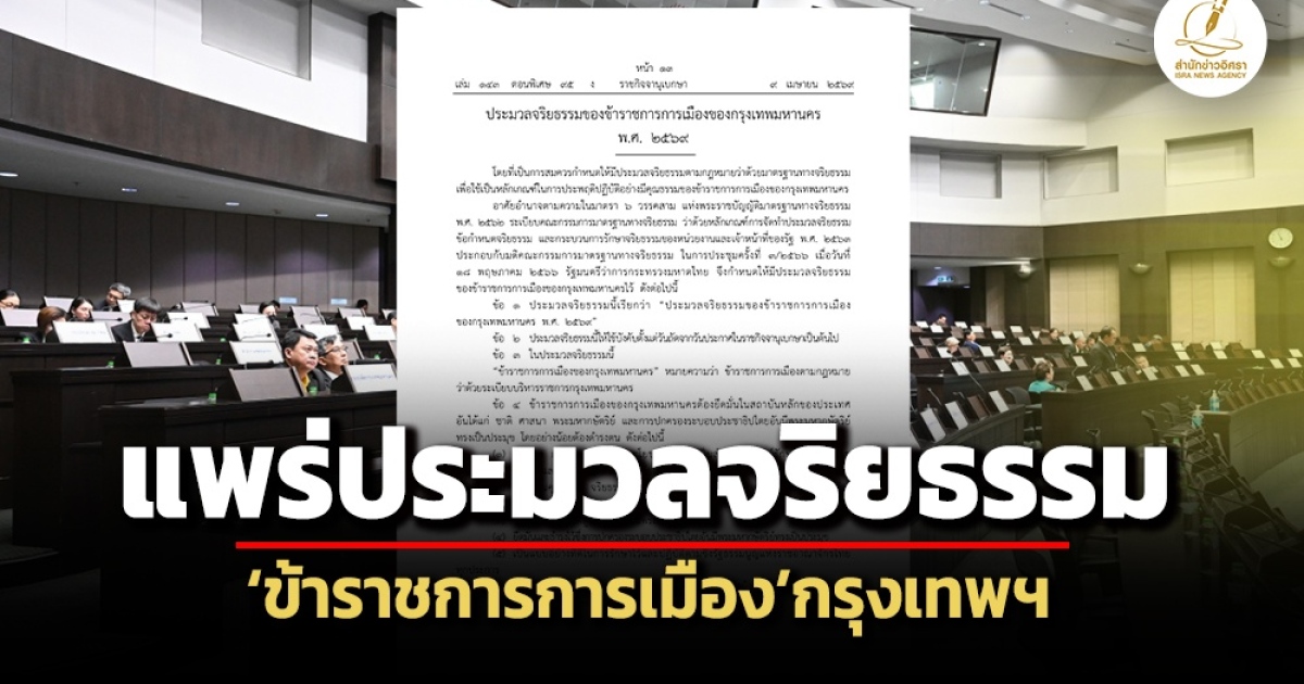 สำนักข่าวอิศรา (www.isranews.org) รายงานว่า เมื่อวันที่ 9 เม.ย.ที่ผ่านมา เว็บไซต์ราชกิจจานุเบกษา เผยแพร่ประมวลจริยธรรมของข้าราชการการเมืองของกรุงเทพมหานคร พ.ศ.2569 โดยมีสาระสำคัญเป็นการกำหนดให้ข้าราชการการเมืองของกรุงเทพมหานครต้อง 'ดำรงตน' ภายใต้ประมวลจริยธรรมของข้าราชการการเมืองของกรุงเทพมหานคร พ.ศ.2569 อย่างน้อย 31 ข้อ โดยประมวลจริยธรรมฯดังกล่าวให้มีผลบังคับใช้ตั้งแต่วันที่ 10 เม.ย.2569 เป็นต้นไป