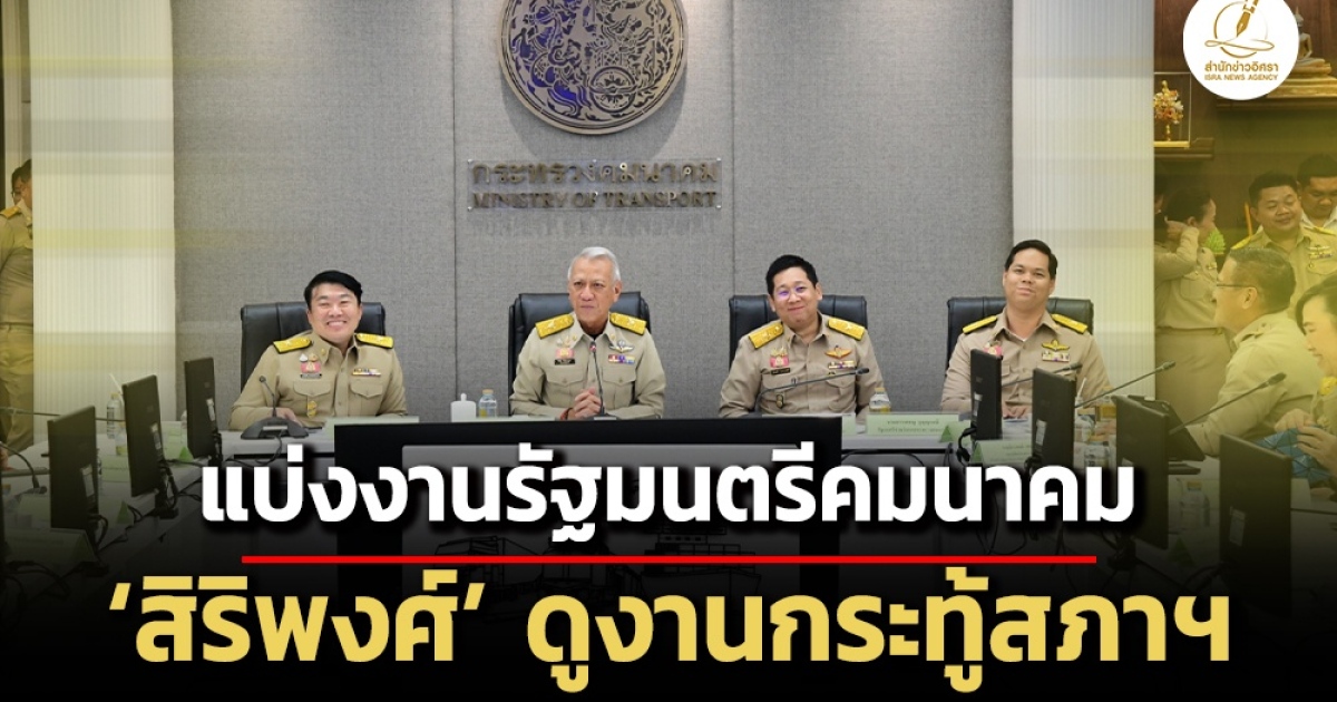 ‘พิพัฒน์’ เซ็นแบ่งงาน 3 รมช.คมนาคมแล้ว ‘สิริพงศ์’ ดูทางบกทั้งหมดรวมหน่วยงานกำกับด้านราง ‘ภัทรพงศ์’ดูหน่วยงานการบิน ขณะที่ ‘สรรเพชญ’ ดูทางน้ำและบริษัทที่ดินรถไฟ ก่อนให้ ‘สิริพงศ์’เป็นผู้ตอบกะทู้สภาฯ