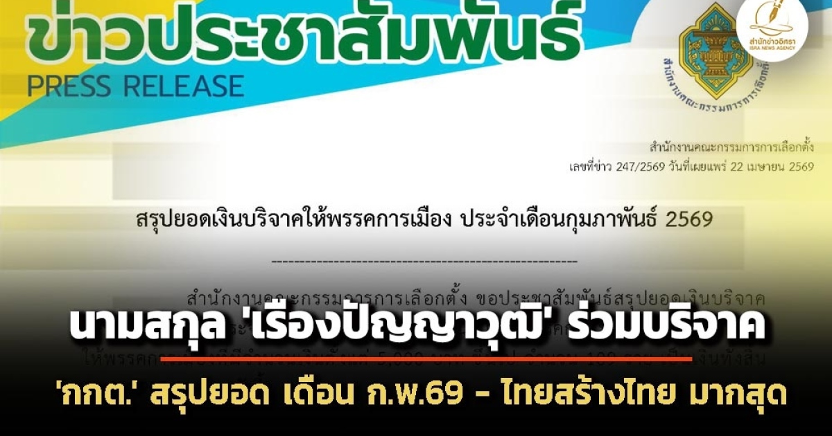 สำนักข่าวอิศรา (www.isranews.org) รายงานว่า วันที่ 22 เมษายน 2569 สำนักงานคณะกรรมการการเลือกตั้ง (กกต.) เผยแพร่ข่าวประชาสัมพันธ์ สรุปยอดเงินบริจาคให้พรรคการเมือง ประจำเดือน ก.พ. 2569 จำนวน 15 พรรคการเมือง มีผู้บริจาคเงินที่มีจำนวนตั้งแต่ 5,000 บาทขึ้นไป จำนวน 109 ราย เป็นเงินทั้งสิ้น 29,494,993.44 บาท