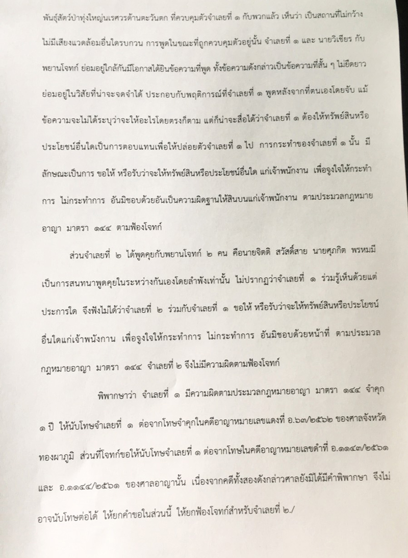 สำหรับคดีนี้ ศาลพิเคราะห์แล้วเห็นว่า โจทก์มีนายวิเชียร ชิณวงษ์ หัวหน้าเขตรักษาพันธุ์สัตว์ป่าทุ่งใหญ่นเรศวรด้านตะวันตก เป็นประจักษ์พยานเบิกความยืนยันข้อความที่จำเลยที่ 1 พูดต่อนายวิเชียรว่า “จะให้นายนพดล พฤกษะวัน มาเคลียร์ มีหนทางช่วยเหลือกันได้ไหม มีเงื่อนไขอะไรไหม ถ้าปล่อยพวกผมอยากได้อะไร ผมจะหามาให้” โดยมีพยานโจทก์ปากอื่นเบิกความสนับสนุนว่าจำเลยที่ 1 พูดข้อความดังกล่าวต่อนายวิเชียร