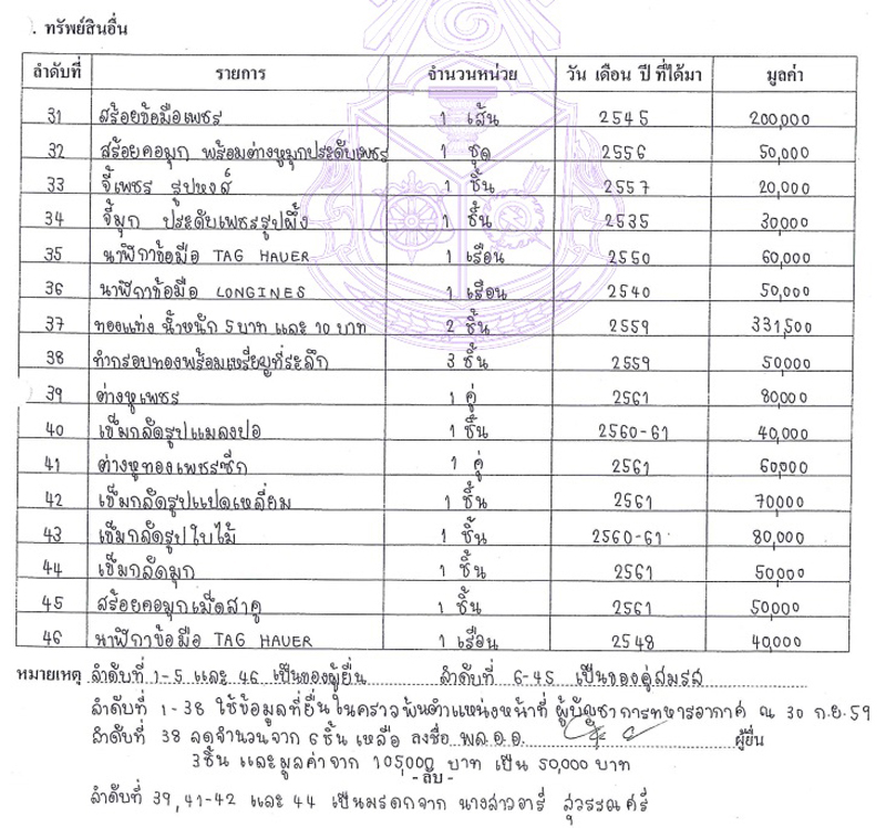 ส่วนทรัพย์สินอื่น ๆ ของ พล.อ.อ.ตรีทศ และ พล.อ.ท.หญิง อุดมลักษณ์ มีทั้งหมด 45 รายการ ส่วนใหญ่เป็นเครื่องประดับ และพระเครื่อง รวมมูลค่า 3,626,500 บาท