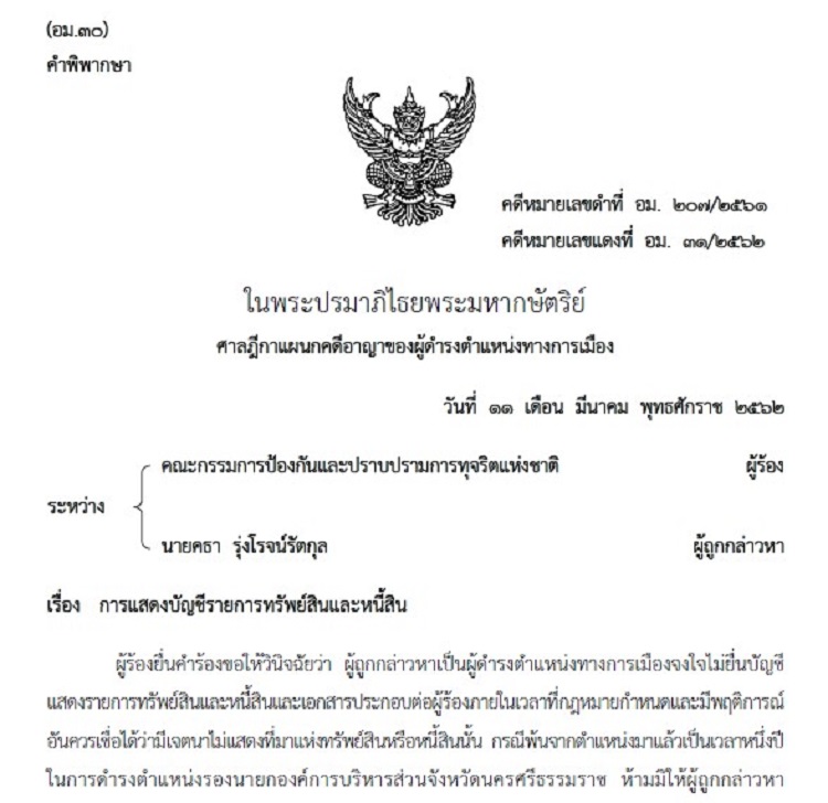 3. นายคธา รุ่งโรจน์รัตกุล รองนายกองค์การบริหารส่วนจังหวัด (อบจ.) นครศรีธรรมราช จงใจไม่ยื่นบัญชีแสดงรายการทรัพย์สินและหนี้สินและเอกสารประกอบต่อผู้ร้องภายในเวลาที่กฎหมายกำหนดและมีพฤติการณ์ อันควรเชื่อได้ว่ามีเจตนาไม่แสดงที่มาแห่งทรัพย์สินหรือหนี้สินนั้น กรณีพ้นจากตำแหน่งมาแล้วเป็นเวลาหนึ่งปี คดีนี้ผู้ร้องมีมติเมื่อวันที่ 5 ก.ค.2561 ก่อนวันที่ 22 ก.ค.2561 ที่พระราชบัญญัติประกอบรัฐธรรมนูญว่าด้วยการป้องกันและปราบปรามการทุจริต พ.ศ.2561 ใช้บังคับ และผู้ร้องยื่นคำร้องต่อศาลในวันที่ 25 ก.ย.2561 อันเป็นเวลาภายหลังที่พระราชบัญญัติประกอบรัฐธรรมนูญว่าด้วยการป้องกันและปราบปรามการทุจริตพ.ศ. 2561 ใช้บังคับแล้ว พิพากษายกคำร้อง. (คดีหมายเลขแดงที่ อม.31/2562 – 11 มี.ค.2562 )