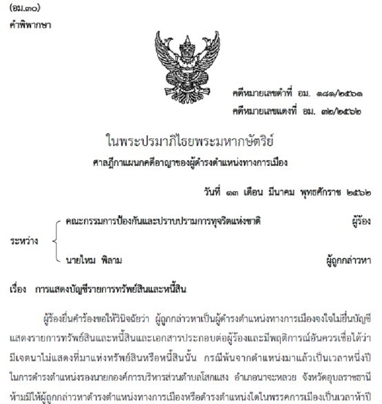 4.นายไหม พิลาม รองนายกองค์การบริหารส่วนตำบล (อบต.) โสกแสง อ.นาจะหลวย จ.อุบลราชธานี จงใจไม่ยื่นบัญชีแสดงรายการทรัพย์สินและหนี้สินและเอกสารประกอบต่อผู้ร้องและมีพฤติการณ์อันควรเชื่อได้ว่ามีเจตนาไม่แสดงที่มาแห่งทรัพย์สินหรือหนี้สินนั้น กรณีพ้นจากตำแหน่งมาแล้วเป็นเวลาหนึ่งปี คดีนี้ผู้ร้องมีมติเมื่อวันที่ 19 ก.ค.2561 ก่อนวันที่พระราชบัญญัติประกอบรัฐธรรมนูญว่าด้วยการป้องกันและปราบปรามการทุจริต พ.ศ. 2561 ใช้บังคับ และผู้ร้องยื่นคำร้องต่อศาลในวันที่ 14 ก.ย.2561 อันเป็นเวลาภายหลังที่พระราชบัญญัติประกอบรัฐธรรมนูญว่าด้วยการป้องกันและปราบปรามการทุจริต พ.ศ. 2561ใช้บังคับแล้ว พิพากษายกคำร้อง. (คดีหมายเลขแดงที่ อม.32/2562 – 13 มี.ค.2562 )
