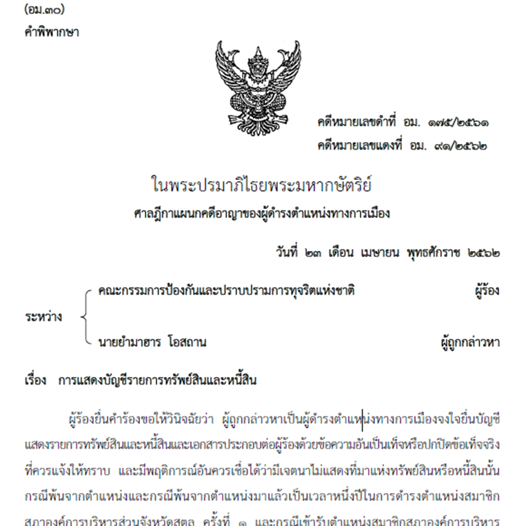 ผู้ถูกกล่าวหายื่นบัญชีแสดงรายการทรัพย์สินต่อผู้ร้องกรณีพ้นจากตำแหน่ง โดยไม่แสดงรายการเงินกู้ธนาคารกรุงศรีอยุธยา จำกัด (มหาชน) จำนวน 2,754,604.38 บาท และกรณีพ้นจากตำแหน่งมาแล้วเป็นเวลาหนึ่งปีในการดำรงตำแหน่งสมาชิกสภา อบจ.สตูล ครั้งที่ 1 ไม่แสดงรายการเงินกู้ธนาคารกรุงศรีอยุธยา จำกัด (มหาชน) จำนวน 2,672,429.68 บาท และเงินกู้ธนาคารเพื่อการเกษตรและสหกรณ์การเกษตร 2 บัญชี จำนวน 176,274.97 บาท และจำนวน 88,020.43 บาท ตามลำดับ และผู้ถูกกล่าวหายื่นบัญชีแสดงรายการทรัพย์สินต่อผู้ร้อง กรณีเข้ารับตำแหน่งสมาชิก สภา อบจ. สตูล ครั้งที่ 2 โดยไม่แสดงรายการเงินฝากธนาคารอิสลามแห่งประเทศไทย สาขาสตูล จำนวน 1,104.94 บาท (คดีหมายเลขแดงที่ อม.91/2562 วันที่ 23 เม.ย.2562)