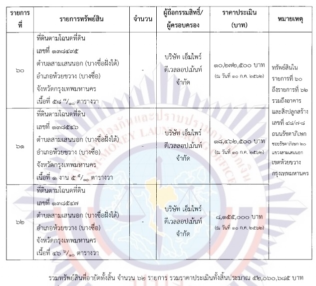 ปปง.อายัดทรัพย์สินเพิ่มคดีทุจริตจำนำข้าว-ระบายข้าวจีทูจี ‘กลุ่มเสี่ยเปี๋ยง’ ที่ดิน 62 รายการ 52 ล้าน บ.เอ็มไพร์ฯ ถือครองกรรมสิทธิ์ฯ ก่อนหน้านี้เคยถูกอายัดทรัพย์สินที่ดิน 13 แปลง 51.5 ล้าน พันคดีบ้านเอื้ออาทร