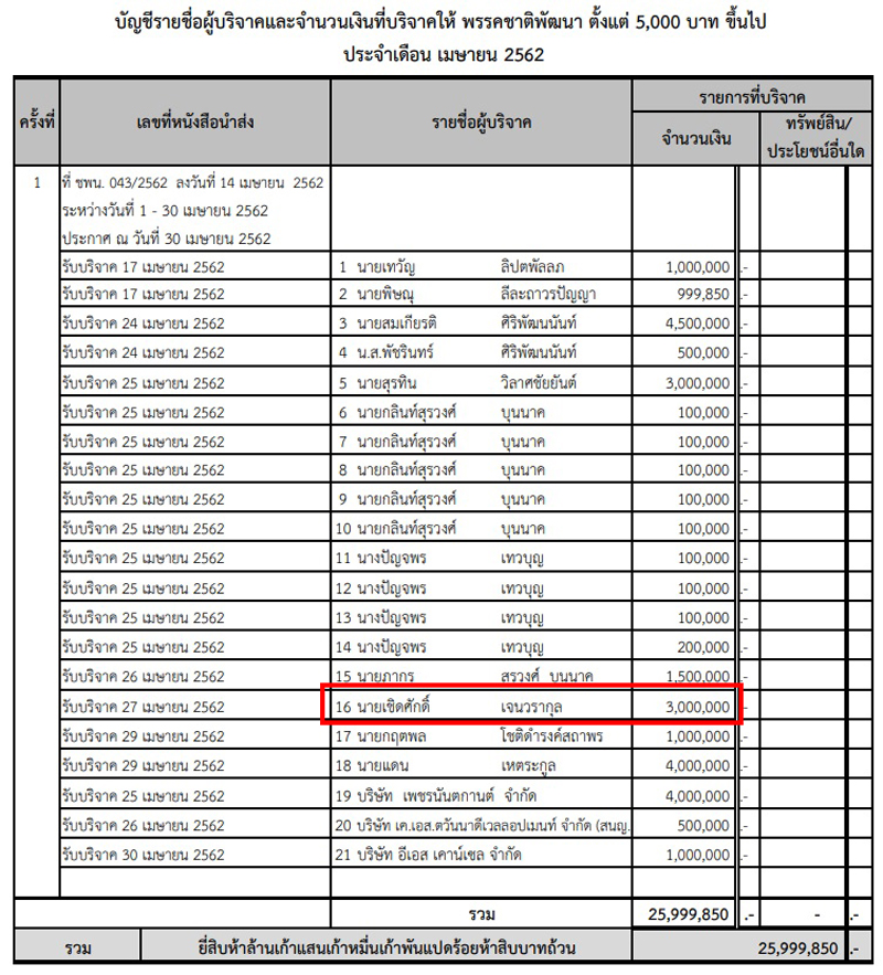 ล่าสุด สำนักข่าวอิศรา www.isranews.org ตรวจสอบพบว่าอีกว่า ในบัญชีรายชื่อผู้บริจาคเงินหรือทรัพย์สินแก่พรรคการเมืองที่เผยแพร่โดยสำนักงานคณะกรรมการการเลือกตั้ง (กกต.) ประจำเดือน เม.ย. 2562 ปรากฏชื่อนายเชิดศักดิ์ เจนวรากุล บริจาคเมื่อวันที่ 27 เม.ย. 2562 วงเงิน 3 ล้านบาท