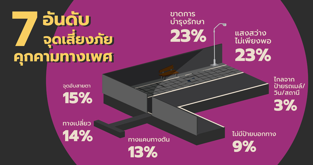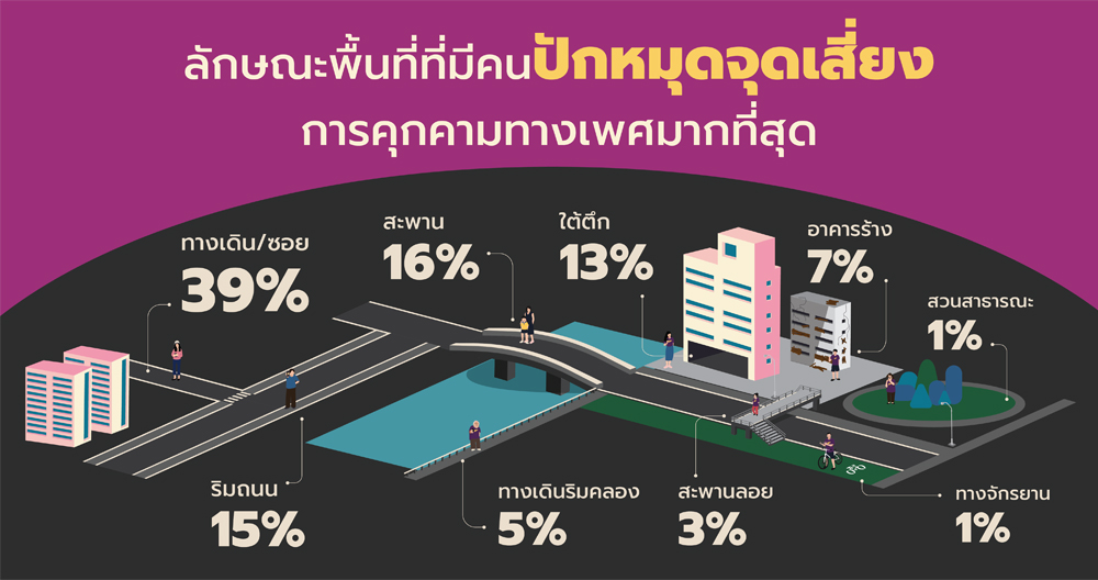 สำหรับลักษณะพื้นที่มีผู้ปักหมุดจุดเสี่ยงต่อการคุกคามทางเพศมากที่สุด คือ ทางเดินและซอย ร้อยละ 39, รองลงมา สะพาน ร้อยละ 16 , ริมถนน ร้อยละ 15, ใต้ตึก ร้อยละ 13, อาคารร้าง ร้อยละ 7, ทางเดินริมคลอง ร้อยละ 7, สะพานลอย ร้อยละ 3, สวนสาธารณะ ร้อยละ 1 และทางจักรยาน ร้อยละ 1 และ 7 อันดับจุดเสี่ยงต่อการคุกคามทางเพศมากที่สุด 1. จุดที่ขาดการบำรุงรักษา ร้อยละ 23, ไฟสว่างไม่เพียงพอ ร้อยละ 23, จุดอับสายตา ร้อยละ 15 , ทางเปลี่ยว ร้อยละ 14, ทางแคบทางตัน ร้อยละ 13, ไม่มีป้ายบอกทาง ร้อยละ 9, ไกลจากป้ายรถเมล์ วิน สถานี ร้อยละ 3