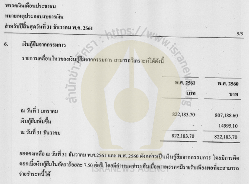 9.พรรคเงินเดือนประชาชน แจ้งในหมายเหตุงบการเงินมีหนี้สินหมุนเวียน เป็นเงินกู้ยืมจากกรรมการ ปี 2561 วงเงิน 822,183 บาท ปี 2560 วงเงิน 822,183 บาท รวม 2 ปีเป็นเงิน 1,644,366 บาท โดยระบุว่า ยอดคงเหลือ ณ วันที่ 31 ธ.ค. 2561 และ 2560 ดังกล่าว เป็นเงินกู้ยืมจากกรรมการ โดยมีการคิดดอกเบี้ยเงินกู้ยืมในอัตราร้อยละ 7.5 ต่อปี โดยมีกำหนดชำระคืนเมื่อทางพรรคมีรายรับเพียงพอที่จะสามารถจ่ายชำระหนี้ได้