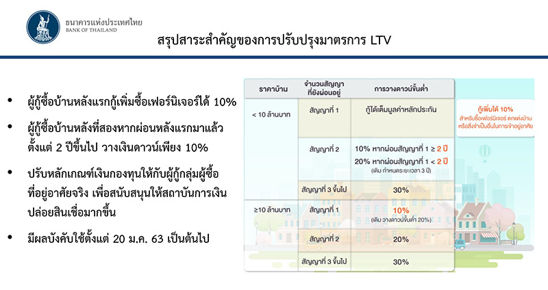 ธปท.ปรับปรุงเกณฑ์ LTV ใหม่ เปิดทางสัญญาบ้านหลังแรก ‘กู้ตกแต่ง-ต่อเติมบ้าน-ซื้อเฟอร์นิเจอร์’ ได้เพิ่มอีก 10% พร้อมลดเงินดาวน์กู้ซื้อบ้านหลังที่ 2 จาก 20% เหลือ 10% หากผ่อนบ้านหลังแรกมาแล้ว 2 ปี