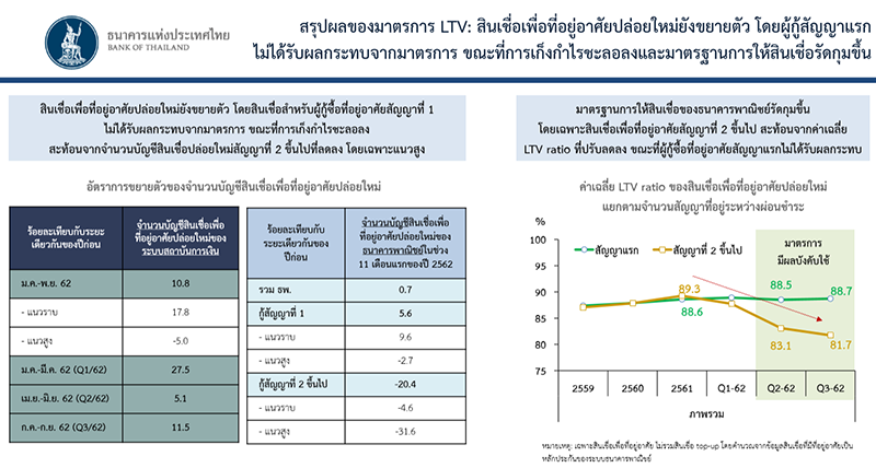 ธปท.ยังนระบุว่า หลังมาตรการ LTV มีผลบังคับใช้ในเดือนเม.ย.2562 สินเชื่อเพื่อที่อยู่อาศัยปล่อยใหม่ยังขยายตัวได้โดยผู้กู้ซื้อบ้านหลังแรกไม่ได้รับผลกระทบ ขณะที่การเก็งกำไรชะลอลง และมาตรฐานการให้สินเชื่อรัดกุมขึ้นโดยเฉพาะการกู้ซื้อบ้านพร้อมกัน 2 หลังขึ้นไป ซึ่งในระยะต่อไป ธปท.ยังต้องติดตามภาวะอุปทานคงค้าง โดยเฉพาะอาคารชุดในบางพื้นที่ ซึ่งได้รับผลกระทบจากการชะลอตัวของอุปสงค์ต่างชาติ และมีอุปทานคงค้างสูงตั้งแต่ก่อนมาตรการ LTV