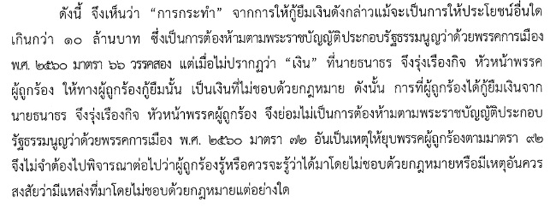 อย่างไรก็ดี การที่พรรคอนาคตใหม่กู้ยืมเงินจากนายธนาธร ถือเป็นการกระทำต้องห้ามตาม พ.ร.บ.ประกอบรัฐธรรมนูญว่าด้วยพรรคการเมือง พ.ศ. 2560 มาตรา 72 หรือไม่นั้น เห็นว่า การตีความกฎหมายต้องดูบทบัญญัติแห่งกฎหมายตามตัวอักษรประกอบกับเจตนารมณ์หรือความมุ่งหมายของบทบัญญัตินั้น ๆ ไปพร้อม ๆ กัน ความมุ่งหมายของบทบัญญัตินี้ไม่ต้องการให้พรรคการเมืองเป็นแหล่งฟอกเงินที่ได้มาโดยผิดกฎหมาย มีเจตนารมณ์สำคัญเพื่อป้องกันมิให้เงินหรือทรัพย์สินซึ่งมีที่มาโดยไม่ชอบด้วยกฎหมายได้รับการบริจาคเข้าสู่พรรคการเมือง เช่นเดียวกับความผิดฐานฟอกเงิน หรือความผิดฐานรับของโจร เป็นต้น ดังนั้นการรับบริจาคตามมาตรา 72 อันเป็นเหตุให้ศาลรัฐธรรมนูญยุบพรรคได้ตามมาตรา 92 นั้น ต้องเป็นกรณีบริจาคเงินที่ได้มาโดยไม่ชอบด้วยกฎหมาย และพรรคการเมืองที่รับบริจาค รู้หรือควรรู้ว่าเป็นทรัพย์สินที่ผู้บริจาคได้มาโดยไม่ชอบด้วยกฎหมาย