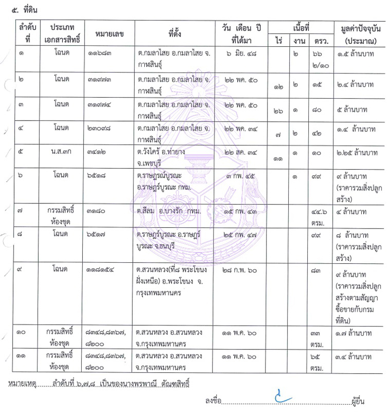 มีรายได้ระหว่าง 3 ปี 5,430,863 บาท เป็นเงินเดือน (ปี 2561-2563) 740,100 บาท ดอกเบี้ยธนาคาร 18,375 บาท ขายที่ดิน/บ้านพร้อมที่ดิน 2.6 ล้านบาท เงินฌาปนกิจศพ 912,388 บาท รับเงินจากคู่สมรส 1,160,000 บาท มีรายจ่าย 3 ปี 4,367,306 บาท เป็นค่าใช้จ่ายครอบครัว/ส่วนตัว 2.3 ล้านบาท ซื้อเครื่องประดับ 4.8 แสนบาท ค่าปรับทุนการศึกษาบุตร 1,587,306 บาท