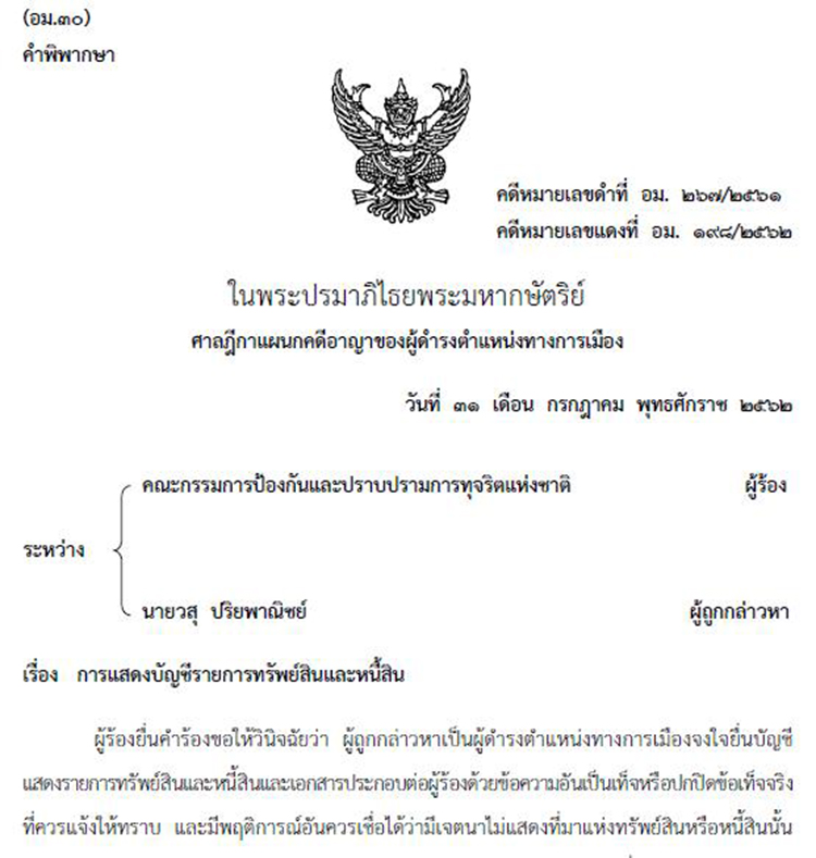 พิพากษาว่า นายวสุ ปริยพาณิชย์ ผู้ถูกกล่าวหาจงใจยื่นบัญชีแสดงรายการทรัพย์สินและหนี้สินและเอกสารประกอบต่อผู้ร้องด้วยข้อความอันเป็นเท็จหรือปกปิดข้อเท็จจริงที่ควรแจ้งให้ทราบ กรณีเข้ารับตำแหน่งและกรณีพ้นจากตำแหน่งรองนายกเทศมนตรีตำบลศาลายา อำเภอพุทธมณฑล จังหวัดนครปฐม ห้ามมิให้ผู้ถูกกล่าวหาดำรงตำแหน่งทางการเมืองหรือดำรงตำแหน่งใดในพรรคการเมืองเป็นเวลาห้าปีนับแต่วันที่ 19 มกราคม 2556 ซึ่งเป็นวันที่ผู้ถูกกล่าวหาพ้นจากตำแหน่งรองนายกเทศมนตรีตำบลศาลายา กับมีความผิดตามพระราชบัญญัติประกอบรัฐธรรมนูญว่าด้วยการป้องกันและปราบปรามการทุจริต พ.ศ. 2542 มาตรา 119 การกระทำของผู้ถูกกล่าวหาเป็นความผิดหลายกรรมต่างกัน ให้ลงโทษทุกกรรมเป็นกระทงความผิดไป จำคุกกระทงละ 2 เดือน และปรับกระทงละ 8,000 บาท รวม 2 กระทง จำคุก 4 เดือน และปรับ 16,000 บาท ผู้ถูกกล่าวหาให้การรับสารภาพเป็นประโยชน์แก่การพิจารณา มีเหตุบรรเทาโทษ ลดโทษให้ กึ่งหนึ่ง คงจำคุก 2 เดือน และปรับ 8,000 บาท ไม่ปรากฏว่าผู้ถูกกล่าวหาเคยได้รับโทษจำคุกมาก่อน โทษจำคุกให้รอการลงโทษไว้มีกำหนด 1 ปี คำขออื่นนอกจากนี้ให้ยก. (คดีหมายเลขแดงที่ อม.198/2562 วันที่ 31 ก.ค.2562)