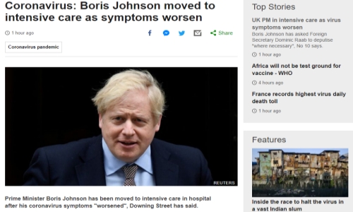 ที่อังกฤษมีรายงานข่าวว่า นายบอริส จอห์นสัน นายกรัฐมนตรีอังกฤษ ซึ่งเข้าแอดมิทที่โรงพยาบาล เซนท์ โธมัส ในกรุงลอนดอน เนื่องจากตรวจพบเชื้อโควิด 19 ก่อนหน้านี้นั้น ต้องย้ายเข้าไปอยู่ในห้องไอซียู เนื่องจากยังคงมีอาการของโรคโควิด 19 ในช่วงบ่ายของวันที่ 6 เม.ย.