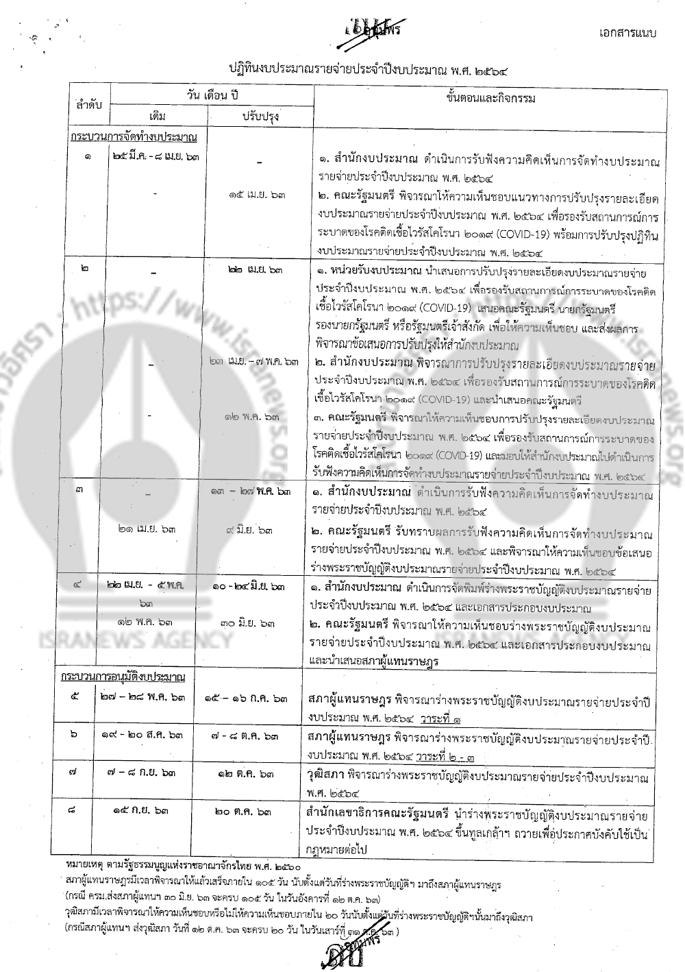 สำหรับปฏิทินงบประมาณปี 2564 ฉบับปรับปรุง กำหนดให้หน่วยรับงบประมาณเสนอการปรับปรุงรายละเอียดงบปี 2564 ต่อ ครม. นายกรัฐมนตรี รองนายกรัฐมนตรี หรือรัฐมนตรีเจ้าสังกัด ให้ความเห็นชอบในวันที่ 22 เม.ย.2563 จากนั้นสำนักงบประมาณจะพิจารณาปรับปรุงรายละเอียดงบปี 2564 และเสนอรายละเอียดงบที่ปรับปรุงแล้วให้ ครม.เห็นชอบวันที่ 12 พ.ค.2563 จากนั้นสำนักงบประมาณจะนำรายละเอียดงบปี 2564 ที่ครม.เห็นชอบไปรับฟังความคิดเห็น