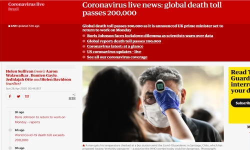 เรียบเรียงจาก:https://mainichi.jp/english/,https://www.worldometers.info/coronavirus/,https://www.straitstimes.com/global,https://www.theguardian.com/world/live/2020/apr/25/coronavirus-live-news-brazils-health-system-on-verge-of-collapse-medics-warn,https://www.bbc.com/news