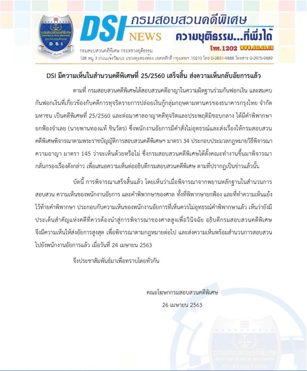 เมื่อวันที่ 26 เม.ย. 2563 กรมสอบสวนคดีพิเศษ (ดีเอสไอ) เผยแพร่เอกสารข่าว ระบุว่า ตามที่ กรมสอบสวนคดีพิเศษได้สอบสวนคดีอาญาในความผิดฐานร่วมกันฟอกเงิน และสมคบกันฟอกเงินที่เกี่ยวข้องกับคดีการทุจริตรายการปล่อยเงินกู้กลุ่มกฤษดามหานครของธนาคารกรุงไทย จำกัด มหาชน เป็นคดีพิเศษที่ 25/2560 และต่อมาศาลอาญาคดีทุจริตและประพฤติมิชอบกลาง ได้มีคำพิพากษายกฟ้องจำเลย (นายพานทองแท้ ชินวัตร) ซึ่งพนักงานอัยการมีคำสั่งไม่อุทธรณ์และส่งเรื่องให้กรมสอบสวนคดีพิเศษพิจารณาตามพระราชบัญญัติการสอบสวนคดีพิเศษฯ มาตรา 34 ประกอบประมวลกฎหมายวิธีพิจารณาความอาญา มาตรา 145 ว่าจะเห็นด้วยหรือไม่