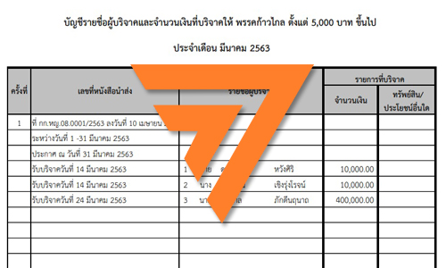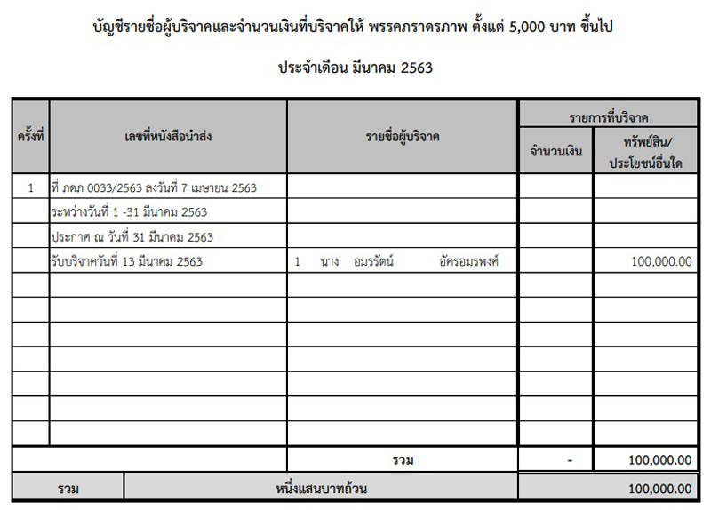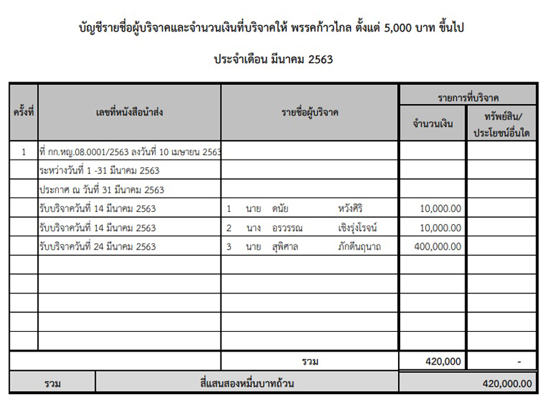 ยอดเงินบริจาคพรรคการเมือง มี.ค. 63 ก้าวไกลได้ครั้งแรกในรอบ 1 ปี 3 เดือน รวม 4.2 แสน ‘พล.ต.ต.สุพิศาล ภักดีนฤนาท’ ส.ส.ปาร์ตี้ลิสต์สีส้ม ประเดิม 4 แสนบาท – ‘เทวัญ’ บริจาคชาติพัฒนา 2.5 ล้าน ‘วันนอร์’ บริจาคประชาชาติ 1 แสน ‘อมรรัตน์ อัครอมรพงศ์’ บริจาคภราดรภาพ 1 แสน