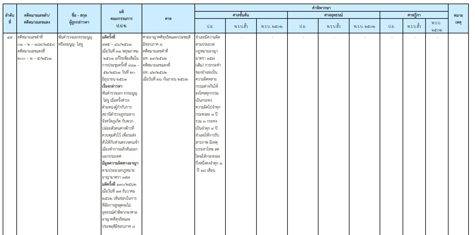 ป.ป.ช. เผยแพร่ผลคดีชี้มูลความผิด พ.ต.อ.ธรรมนูญ ไฝจู อดีตผกก.สถานีตำรวจภูธรถลาง จังหวัดภูเก็ต ปล่อยตัวคนต่างด้าวที่รอส่งตัวให้ด่านตรวจคนเข้าเมืองผลักดันออกนอกปท. ล่าสุด ศาลอาญาคดีทุจริตประพฤติมิชอบภาค 8 พิพากษาว่า จำคุก 3 กระทง 9 ปี รับสารภาพ ลดโทษให้กึ่งหนึ่ง เหลือ 3 ปี 18 เดือน