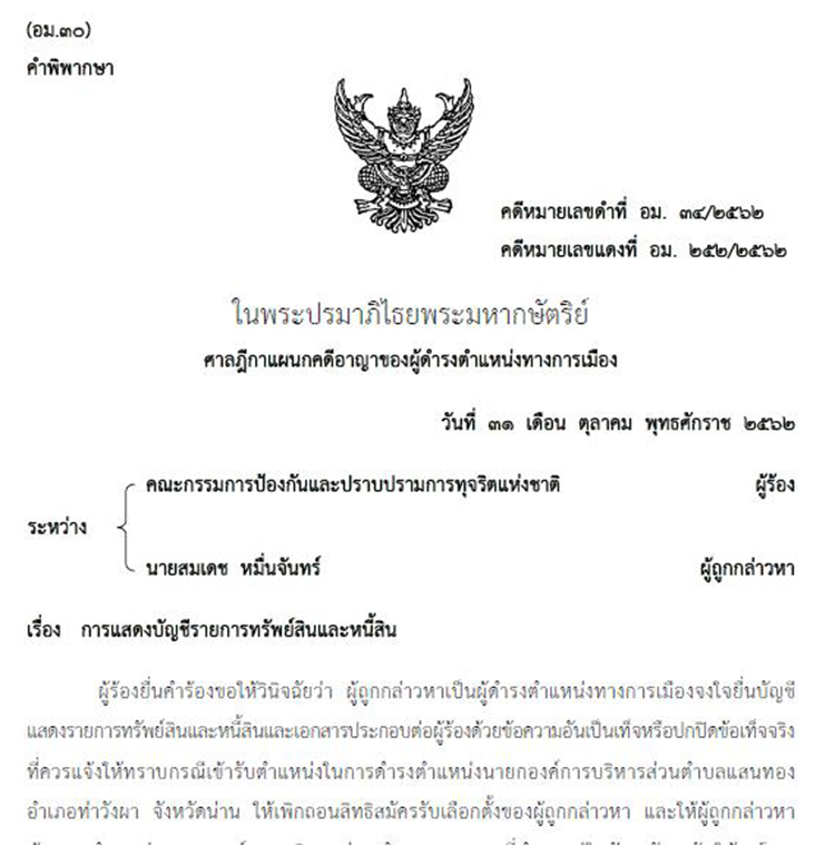 ลอตใหม่ปี 63 !ศาลฎีกาฯฟัน 6 คดีบัญชีทรัพย์สิน-ให้นายก อบต.บางขนุน นนทบุรี พ้นทันที