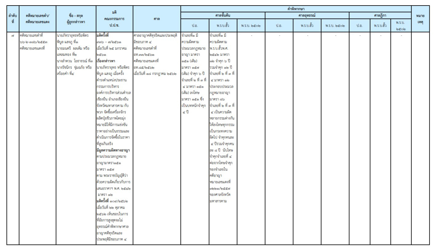 ส่วน นายมนตรี ผลเต็ม หรือ แหลมทอง นางลำดวน โยธาธรณ์ นางรัชนีกร ชุ่มอภัย หรือ สร้อยคำ จำเลยที่ 2 , 3 และ 4 มีความผิดลงโทษประมวลกฎหมายอาญา มาตรา 151 ซึ่งเป็นบทหนักจำคุก 4 ปี และมีความผิดตาม พ.ร.บ.ฮั้ว พ.ศ. 2542 ประกอบประมวลกฎหมายอาญา มาตรา 86 เป็นความผิดหลายกรรมต่างกัน ให้ลงโทษทุกกรรมเป็นกระทงความผิดไป จำคุกคนละ 4 ปี