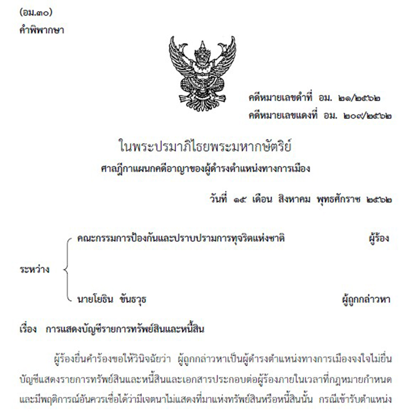 1.นายโยธิน ขันธวุธ นายกองค์การบริหารส่วนตำบล (อบต.) บึงนคร อ.ธวัชบุรี จ.ร้อยเอ็ด จงใจไม่ยื่นบัญชีแสดงรายการทรัพย์สินและหนี้สินและเอกสารประกอบต่อผู้ร้องภายในเวลาที่กฎหมายกำหนดและมีพฤติการณ์อันควรเชื่อได้ว่ามีเจตนาไม่แสดงที่มาแห่งทรัพย์สินหรือหนี้สินนั้น กรณีเข้ารับตำแหน่ง
