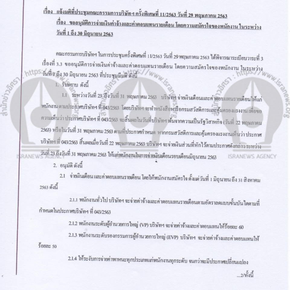สำนักข่าวอิศรารายงานว่า สำหรับหนังสือแจ้งมติบอร์ดการบินไทยเมื่อวันที่ 29 พ.ค.ระบุว่า คณะกรรมการบริษัท ในคราวประชุมครั้งพิเศษที่ 11/2563 วันที่ 29 พฤษภาคม 2563 ได้พิจารณาระเบียบวาระที่ 3 เรื่องที่ 33 ขออนุมัติการจ่ายเงินเดือนและค่าตอบแทนรายเดือน โดยความสมัครใจของพนักงาน ในระหว่างวันที่ 1 ถึง 30 มิถุนายน 263 ที่ประชุมมีมติดังนี้