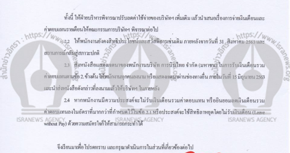 2.3 ส่งหนังสือแสดงเจตนาของพนักงานบริษัท การบินไทย จำกัด (มหาชน) ในการรับเงินเดือนรวมค่าตอบตามข้อ 2 ข้างต้นให้พนักงานทุกคนลงนาม หรือเสดงจตนผ่านช่องทางอื่น ภายในวันที่ 15 มิถุนายน 2563 และนำส่งหนังสือดังกล่าวที่ลงนามแล้วให้บริษัทฯ ในภายหลัง