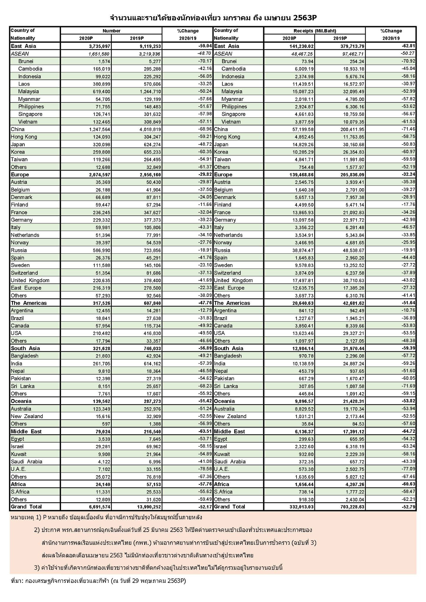 ก.ท่องเที่ยวฯเผยตัวเลขนักท่องเที่ยวต่างชาติเดือนเม.ย.63 เป็นศูนย์ หลังเจอผลกระทบโควิด-ห้ามเครื่องบินต่างชาติเข้าไทย ขณะที่ 4 เดือนแรกนักท่องเที่ยวต่างชาติอยู่ที่ 6.69 ล้านคน ลดลง 52.17% คาดนักท่องเที่ยวต่างชาติเป็นศูนย์อีกอย่างน้อย 2 เดือน หลังกพท.ขยายเวลาห้ามบิน