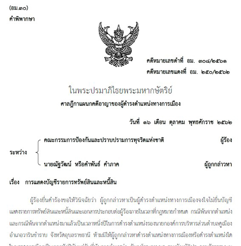 สำนักข่าวอิศรา www.isranews.org รายงานว่า เมื่อวันที่ 24 เม.ย.2563 ราชกิจจานุเบกษา เผยแพร่คำพิพากษาศาลฎีกาแผนกคดีอาญาของผู้ดำรงตำแหน่งทางการเมือง คดีการแสดงบัญชีรายการทรัพย์สินและหนี้สิน โดยคณะกรรมการป้องกันและปราบปรามการทุจริตแห่งชาติ (คณะกรรมการ ป.ป.ช.) ผู้ร้อง รายนายณัฐวัฒน์ หรือคำพันธ์ คำภาค รองนายกองค์การบริหารส่วนตำบล (อบต.) คูเมือง อ.วารินชำราบ จ.อุบลราชธานี จงใจไม่ยื่นบัญชีแสดงรายการทรัพย์สินและหนี้สินและเอกสารประกอบต่อผู้ร้องภายในเวลาที่กฎหมายกำหนด กรณีพ้นจากตำแหน่งและกรณีพ้นจากตำแหน่งมาแล้วเป็นเวลาหนึ่งปี พิพากษายกคำร้อง